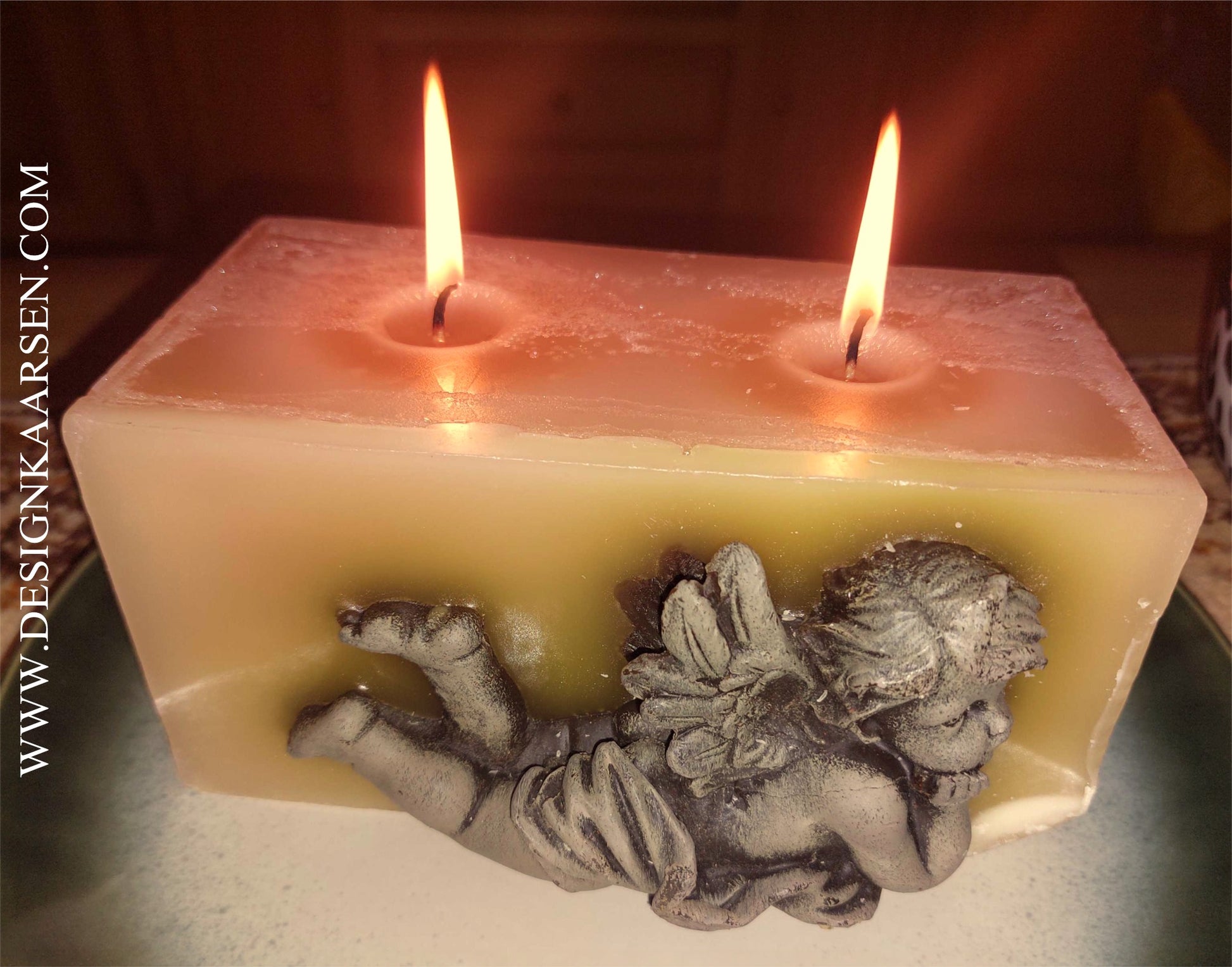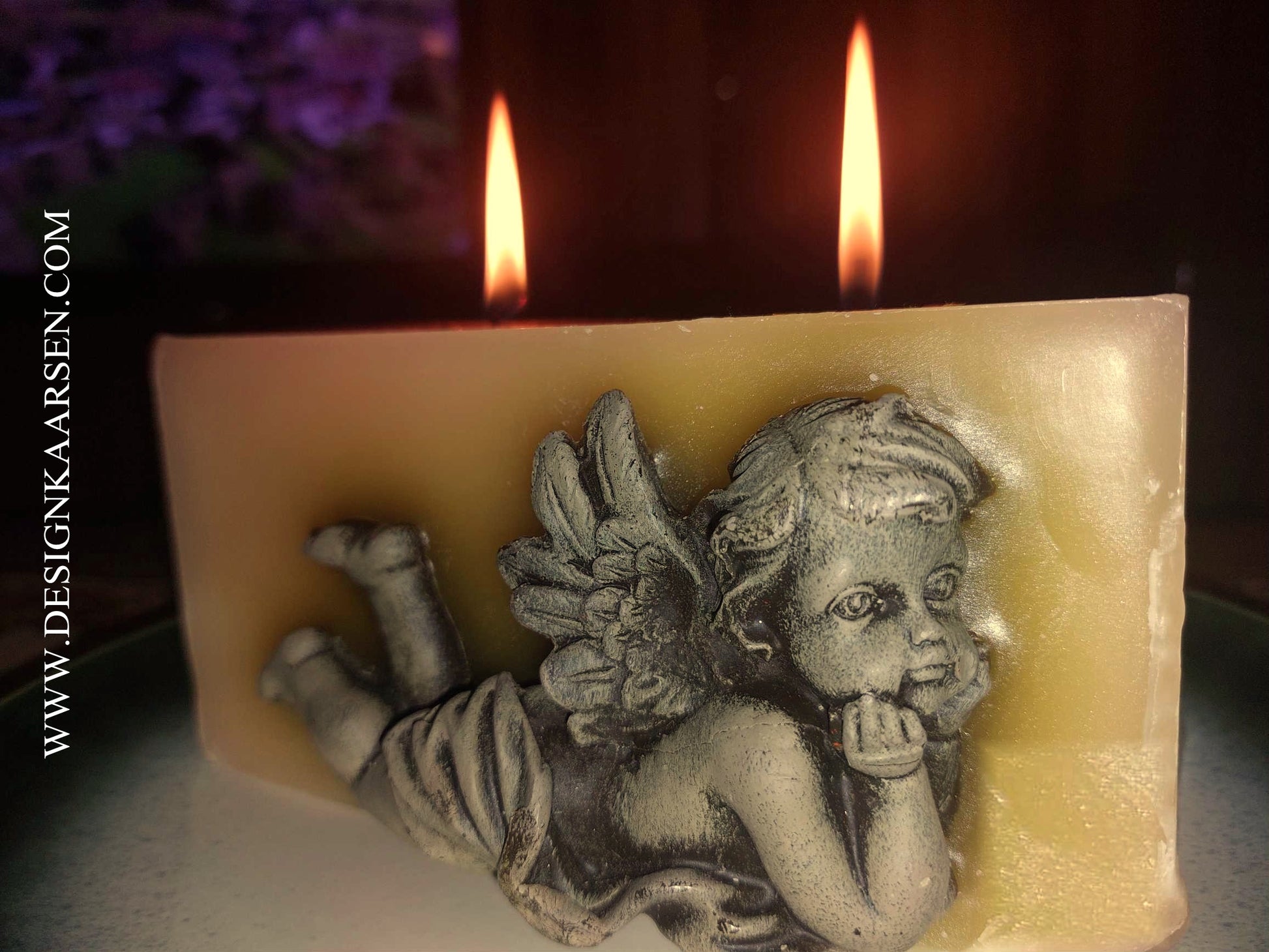 ============================== Prachtige 2 pits kaars met daarop een 3d applicatie van een engeltje. Deze unieke kaars is uiteraard met de hand gemaakt.