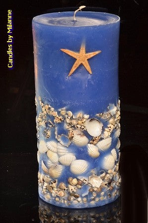 ============================== Supergrote Zeekaars in prachtig blauw. Deze kaars is 26 cm hoog en is uitgevoerd met echte schelpen.
