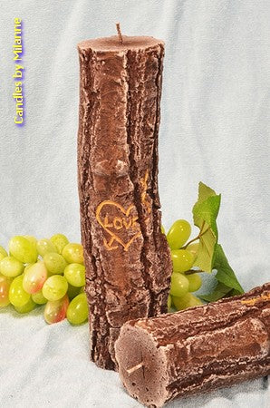 Wunderschöne Kerze in Form eines Baumstammes. Und dann auch noch mit einem romantischen Text.